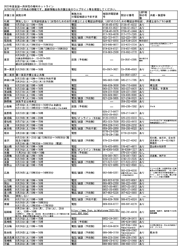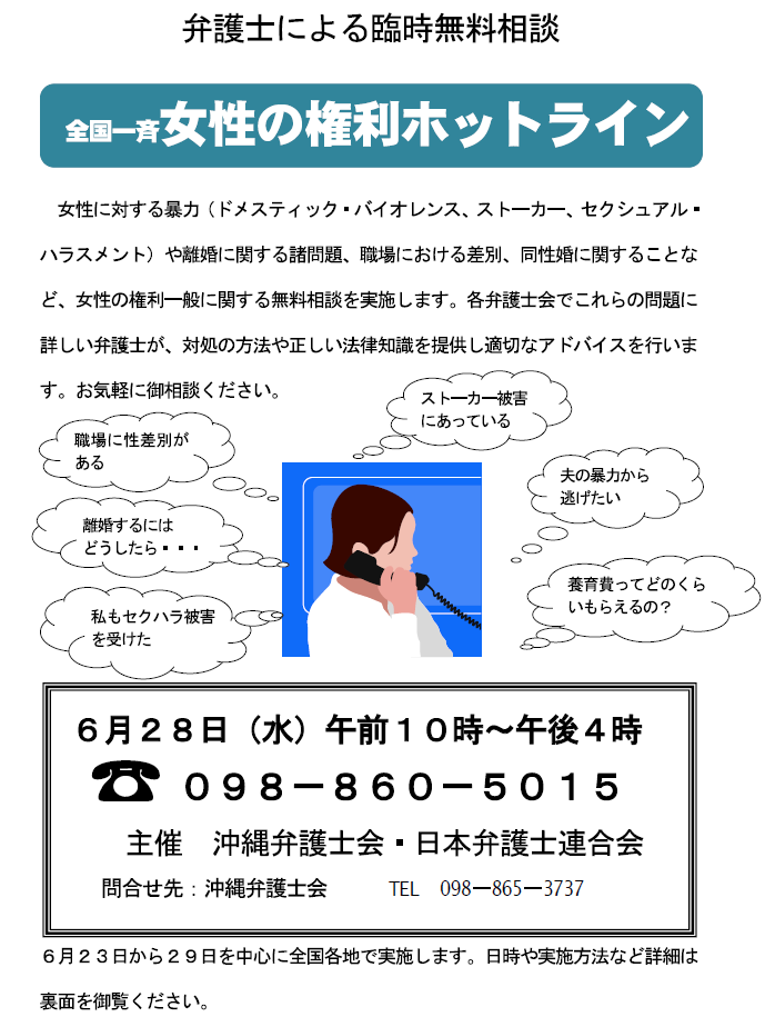 6/28(水)10:00~16:00 全国一斉女性の権利ホットライン電話相談会